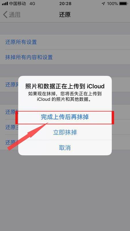 5、所以选择第二项“抹除所有内容和设置”,点击“完成上传后再抹掉”或者“立即抹掉”(建议选择第一项备份重要数据)。