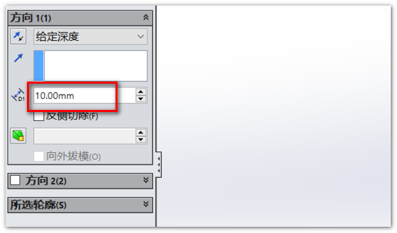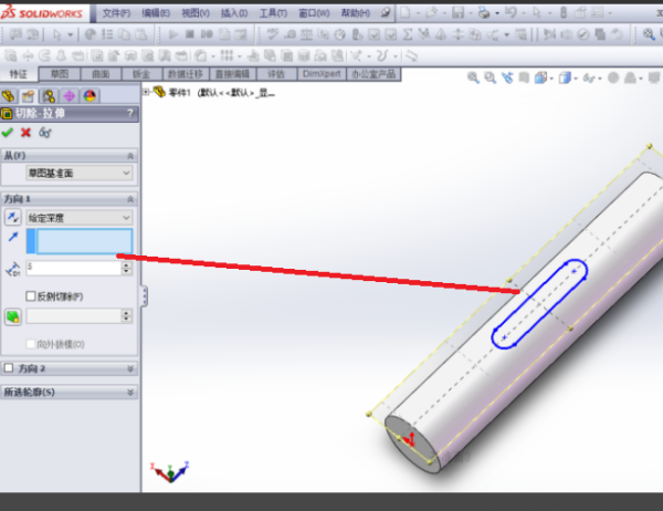4、使用特征里面的拉伸切除工具,进行切除,深度为10,确定。