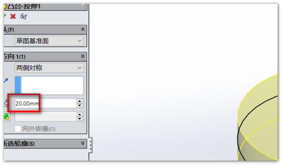2、使用特征里面的拉伸凸台工具,进行拉伸,拉伸深度为20,确定。