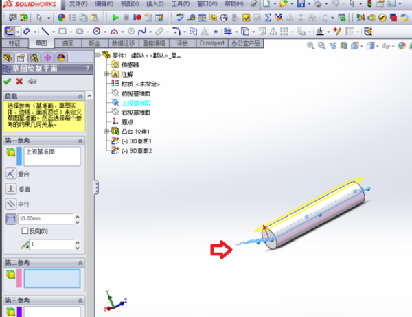 2、然后点击草图-草图绘制平面,选择上视基准面为第一参考面,如图所示,距离上视基准面高度为半径大小,即10mm。