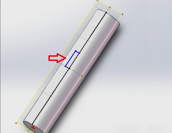 3、在新建的基准面上绘制一条直线,两端的与零件端点重合。在直线中心绘制一个键槽的四分之一矩形。