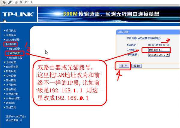 a:网络设置(参数)------lan口设置----修改地址为 10.0.0.1 (这个保留地址稍偏僻不容易和别人冲突),点保存 ,下图参阅