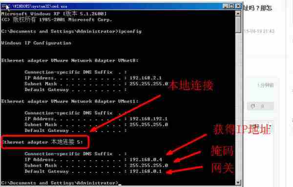 会出现本机获得的IP,掩码和网关,如图,点击大图