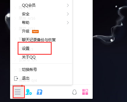 二、出现热键冲突的常见软件是QQ、微信、浏览器等,需要逐个进行排查,而QQ则是最容易导致热键冲突的软件,这时打开QQ,点击左下角图标,弹出菜单中点击“设置”。