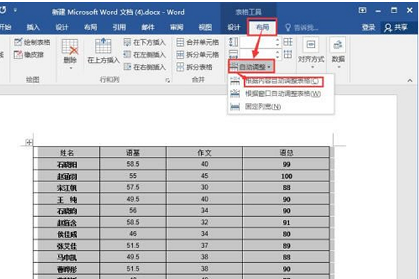 2、之后在菜单栏的“布局”选项卡中点击“自动调整”按钮,在弹出的下拉菜单中点击“根据内容自动调整表格”。
