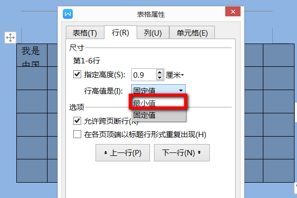 4、进入表格属性里面之后,切换到行,并在行高值这一栏中将固定值改为最小值。