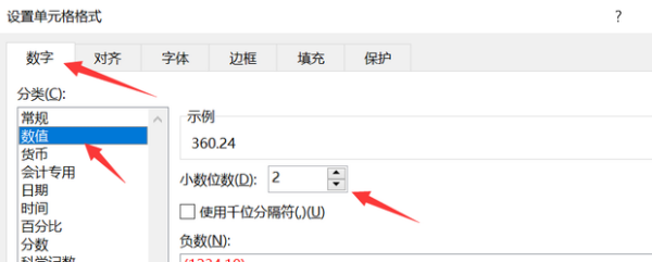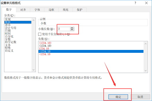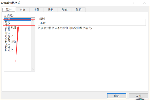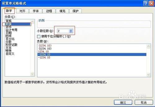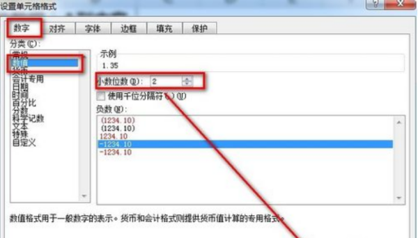 4.在数字选项卡下选择数值,在右方设置小数位数为2