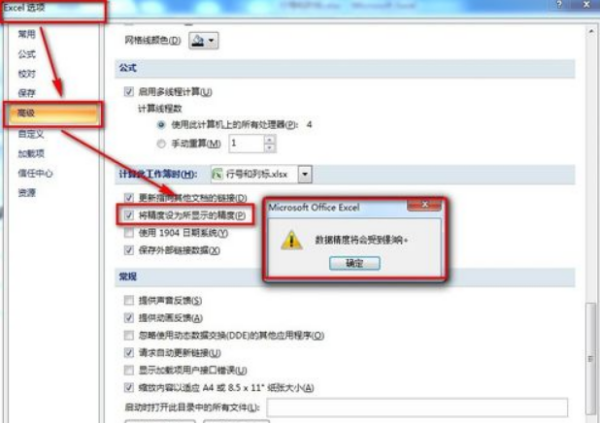 按照第一或第二种方法设置单元格格式后,点击【Office按钮】-【Excel选项】-【高级】-【计算此工作簿时】-选择【将精度设为所显示的精度】,完成设置后点击【确定】按钮。