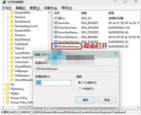 第三步、将新建的DWORD(32位)值,命名为“Minthumbzizepx”,双击该项目,打开编辑DWORD(32位)值,将数值数据设置成350,系统默认为230,您可以根据个人实际情况设置,设置完成后,点击确定,推出设置界面。