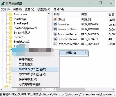 第二步、在注册表编辑器界面,依次展开HKEY_CURRENT_USER\Software\Microsoft\Windows\CurrentVersion\Explorer\Taskband,点击选中Taskband后,在右侧窗口空白处,单击鼠标右键,菜单中鼠标指向新建,次级菜单中点击选择“DWORD(32位)值”。