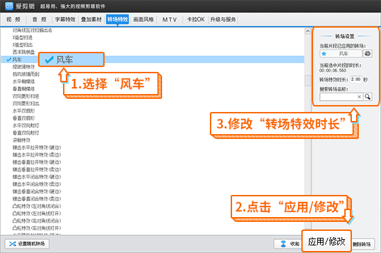 爱剪辑自带超级丰富实用的转场。选中位于后位的视频缩略图,在“转场特效”面板下,勾选转场即可。
