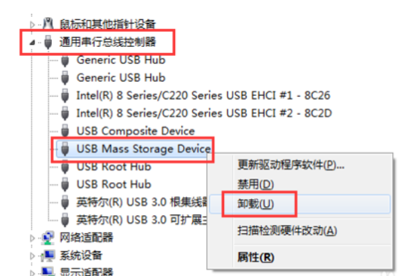 3· 特别的,针对大容量存储设备,如U盘等,需要在“通用串行总线控制器”列表中找到“USB Mass Storage Device”项,右击并从其右键菜单中选择“卸载”项以删除对应的驱动程序。
