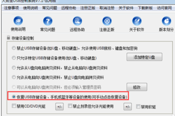 7· 下载并安装此工具后,直接按“Alt+F2”即可唤醒程序主界面,在其主界面中直接勾选“恢复USB存储设备、手机和蓝牙设备的正常使用”项即可重新启用USB存储设备。