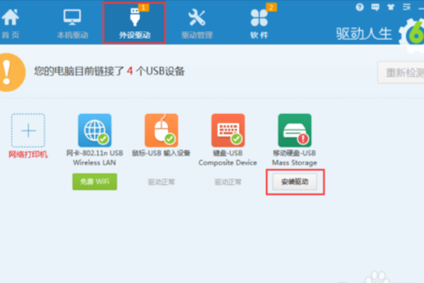 5· 如果电脑安装USB设备驱动失败时,则需要再次删除大容量USB存储设备驱动,并借助“驱动精灵”或“驱动人生”实现全自动安装USB设备驱动程序的操作。