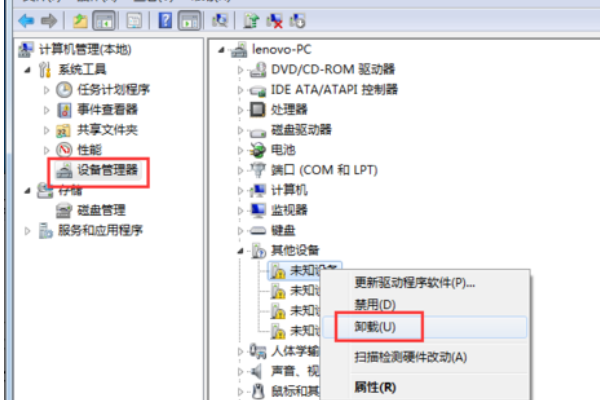 2· 待打开“计算机管理”界面后,展开“设备管理器”项-“通用串行总线控制器”列表或“未知设备”列表,从中找到显示有黄色感叹号的设备并右击,从其右键菜单中选择“卸载”项以卸载对应设备的驱动程序。