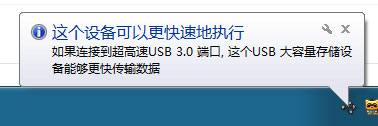 1、将此U盘插入USB2.0插口,如果是3.0的U盘,系统会出现如下图所示的提示信息。