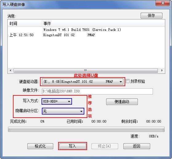 ISO模式2.3:打开ISO模式的一键制作启动U盘,点击ISO模式里的按钮,按照图中推荐选项进行选择,最后点击写入按钮等待写入完成。(如需刻录光盘,点击“刻录光盘”按钮进行刻录操作!)