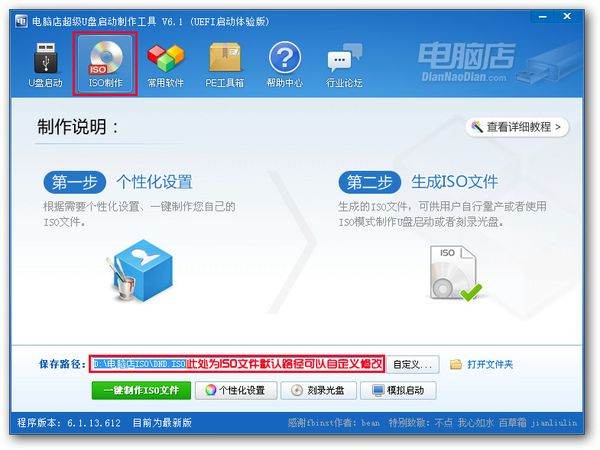 ISO模式2.2:点击“一键制作启动U盘”按钮后程序会在“D:\电脑店ISO\”文件夹下创建DND.ISO镜像。