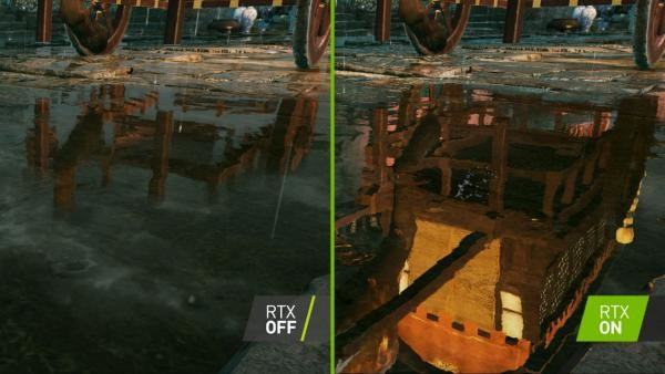 可以看到,在华硕DUAL-RTX2070开启RTX后,卫兵的铠甲反射着挂着一排火红灯笼的城门,水面反射出马车的倒影,纤毫毕现,真实且富有质感。而没有RTX技术的显卡画面只剩下灰蒙蒙一片。同时,华硕DUAL-RTX2070通过DLSS技术提高抗锯齿效果,根据实测,抗锯齿能力较上一代GTX1070提升60%左右,非常强悍。