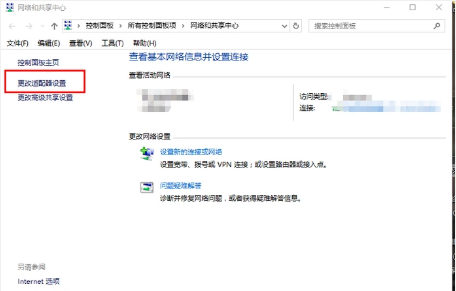 2、打开“网络和共享中心”后,选择“更改适配器设置”。