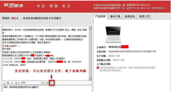 5、进入以后开始排队,等待人工服务,用户界面有一个白色类似纸张的“发送按钮”可以发送图片文件,便于故障判断。右侧是产品信息。