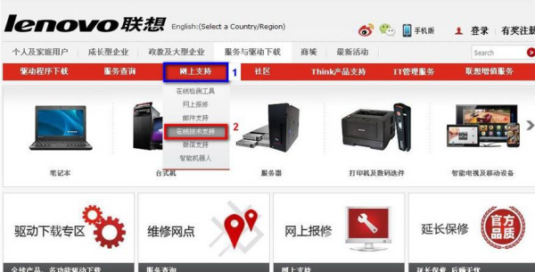 1、打开联想官方网站,点击1:“服务与驱动下载”,点击2:“电脑服务与支持”。