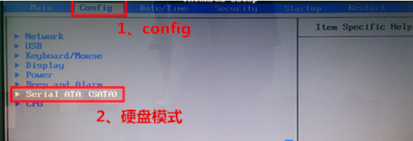 2、然后在Config选项下,找到Serlal ATA (SATA)这一项,这一项就是硬盘模式,选定它,按Enter键: