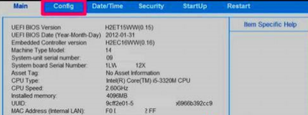1、进入BIOS后,显示的是Main这个界面,要把光标移到Config这个选项上来: