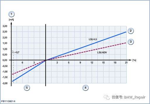 通过宽带氧传感器可以无级测得一个介于0.65和空气之间的空燃比 (稳定的特性线)。宽带氧传感器比先前版本LSU 4.9更快地准备就绪。