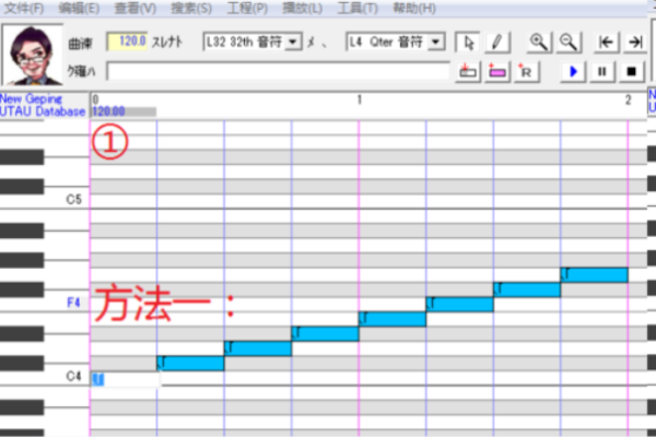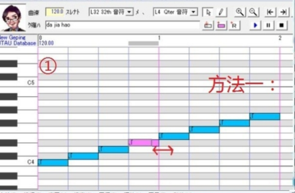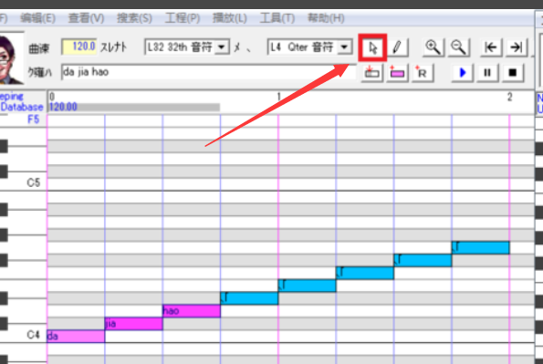 6、歌词的灌入分为两种方法:1.双击音符输入歌词(注:中文音源一般为输入拼音)。2.使用歌词框进行批量输入。(记得要选定相应的歌词后点击换歌词按钮)。