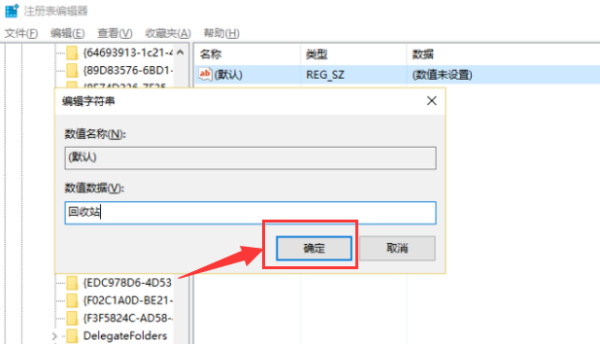 五、点击该新建项,双击右侧的“默认”修改其数值数据为“回收站”,如下图所示: