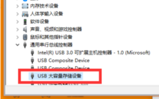 3、在打开的“设备管理器”窗口中,展开“通用串行总线控制器”->“USB大容量存储设备”项