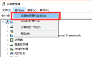 5、“USB大容量存储设备”项消失后,左击“操作”,从弹出的菜单中选择“扫描检测硬件改动”项