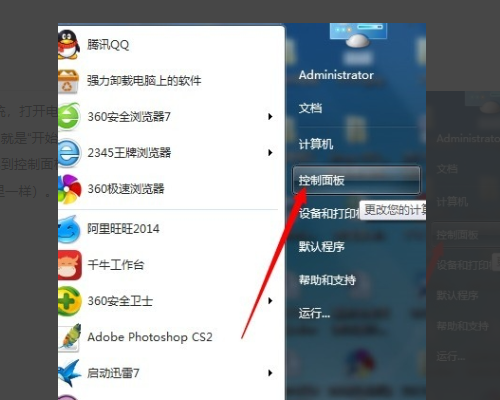 1、打开电脑的windows7系统,打开电脑的左下角的圆形的图标按钮(就是“开始”按钮),弹出一个菜单,找到控制面板。