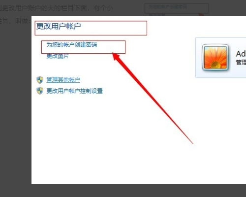3、打开用户账户图标并点击进入,最后一步是找到更改用户账户的大的栏目下面,有个小的栏目,叫做:为你账户创建密码。点击进入。