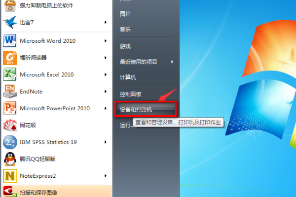 1、首先点击电脑开始菜单,选择设备与打印机。