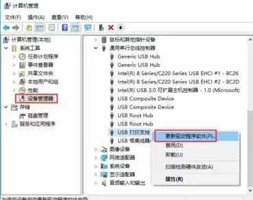 第二步:设备管理器_"通用串行总线控制器”_“USB打印支持”并右击选择“更新驱动程序”