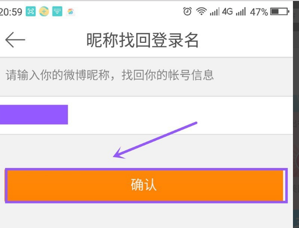 3、在出现的三个选项中,点击“找回登录名”然后会跳转到新的页面中,输入你的新浪微博昵称后,点击“确定”。