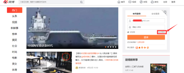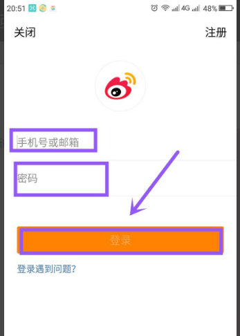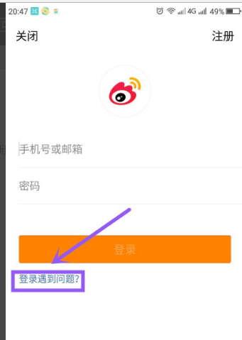 2、点击新浪微博账号后,进入新浪微博的登录页面,然后点击“登录遇到问题”