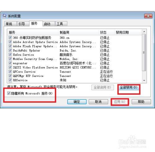 第三种就是无法正常启动,删除模板也不行,这时可以点击开始——运行——输入msconfig(快速方式就是win键+R就可打开运行方式)——服务——勾选隐藏所有microsoft——全部禁用——应用,然后重启电脑就可以恢复正常了。