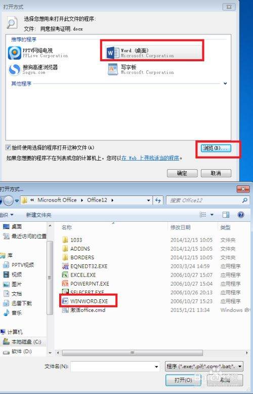 第一种情况:不恰当的操作导致word文档的打开方式被改变了,从而打开时跳出选择程序的选项,这时我们可以右击——选择打开方式——选择word程序,如果没有推荐的word程序,点击浏览——C:\Program Files\Microsoft Office\Office12目录下的winword.exe程序——勾选“始终使用选择的程序打开文件”,然后今后打开的word文件就能正常打开了。