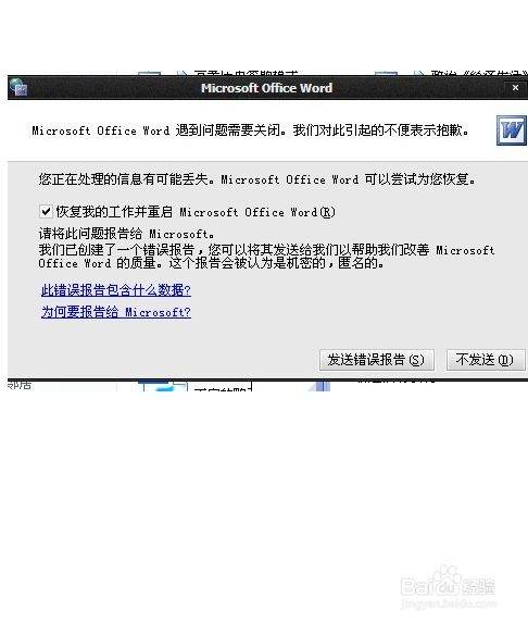 1、word强制关闭,提示发送错误报告,然后要求重新启动word。