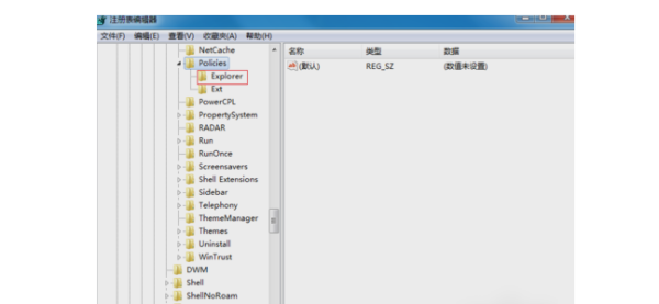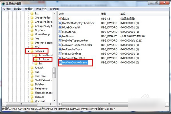 3、打开了注册表编辑器之后,依次打开文件“HKEY-CURRENT-USER-Software-Microsoft-Windows-CurrentVersion-Policies-Explorer”然后在Explore文件夹里面找到“NoViewContexMenu”键,双击此选项进入。
