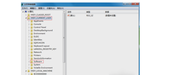 2、然后在注册表里,双击名为HEKY_CURRENT_USER的文件夹,在它的子目录里再双击“Software”。