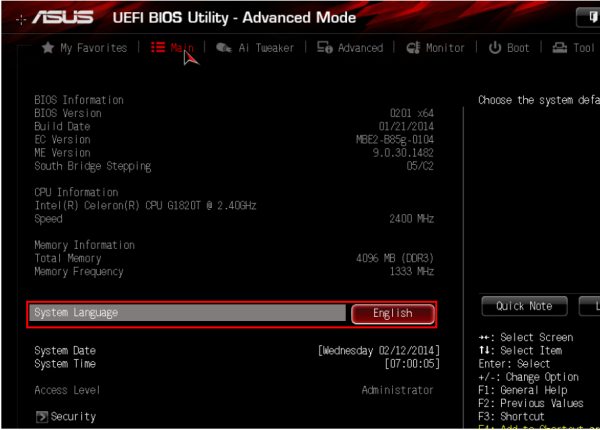 2:点击MAIN菜单------system Language ,将此项设置为简体中文,即可以中文显示bios内容。