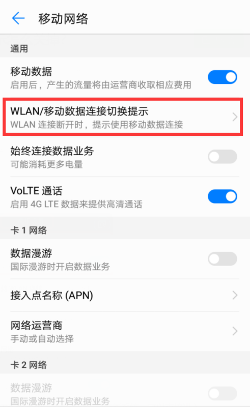 4、进入“移动网络”页面,选择“WLAN/移动数据连接切换提示”。