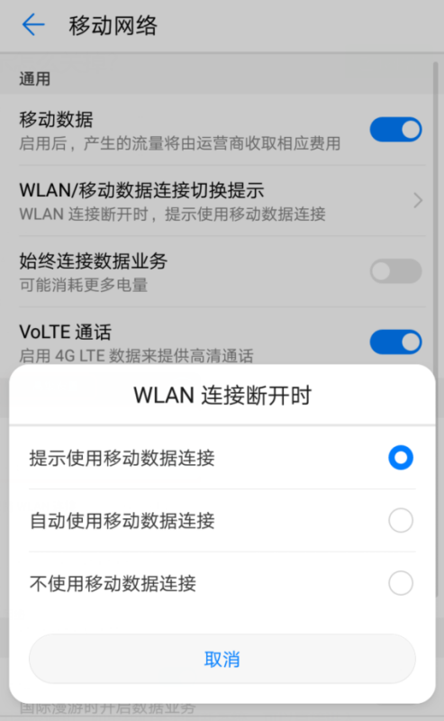 5、在“WLAN/移动数据连接切换提示”中,选择“自动使用移动数据连接”,这样连接wifi的提示就会关掉了。