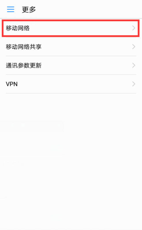 3、在“更多”里,出现四个功能选项,即“移动网络”“移动网络共享”“通讯参数更新”和“VPN”,选择“移动网络”。