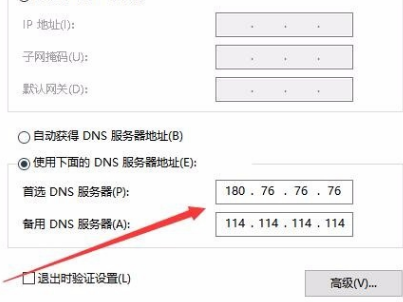 5、在打开的设置窗口中,选中“使用下面的DNS服务器地址”设置项,然后在下面设置好百度的公共DNS服务器地址。最后点击确定按钮即可。