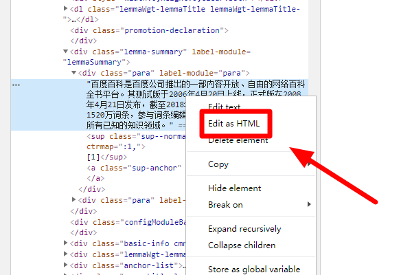 3、在弹出的控制台中右击需要复制的文字,然后点击“Edit as HTML”按钮: